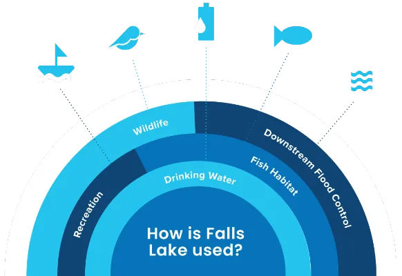 Falls Lake Reservoir was constructed in the late 1970s. The lake was filled in the early 1980s. Water quality studies predicted the lake would be eutrophic (producing too much algae). Algal growth today is below originally predicted levels.